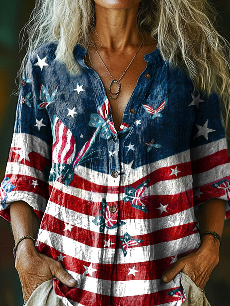 Women's Vintage American Flag Butterfly Art Print Casual Cotton Linen Shirt