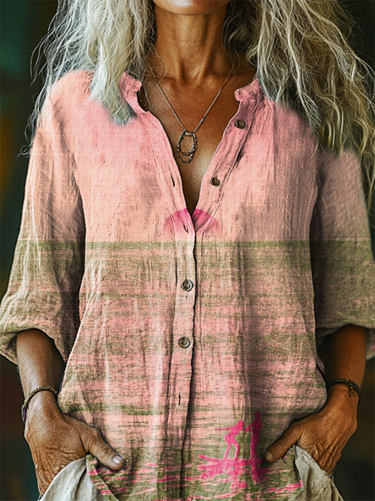 Women's Ocean Sunset Pattern Art Print Casual Cotton Linen Shirt