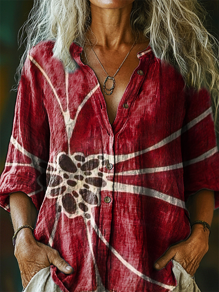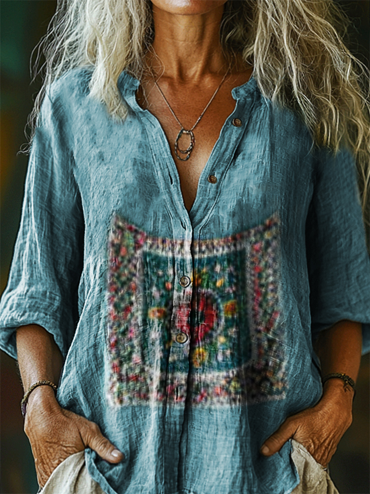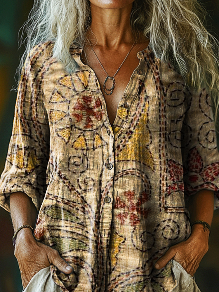 Women's Bohemian Pattern Art Print Casual Cotton Linen Shirt