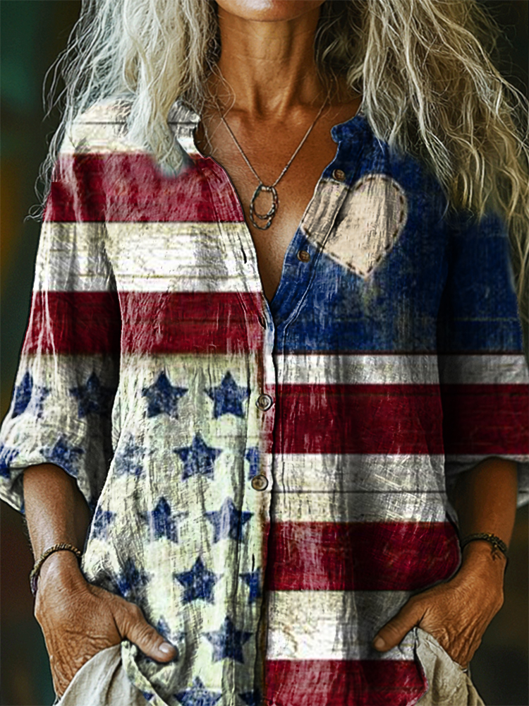 Women's Independence Day Retro Stars Patchwork Art Print Cotton and Linen Shirt