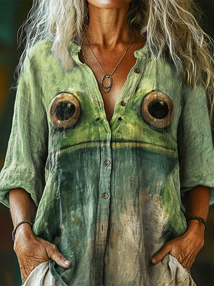 Women's Vintage Cute Frog Art Print Casual Cotton and Linen Shirt