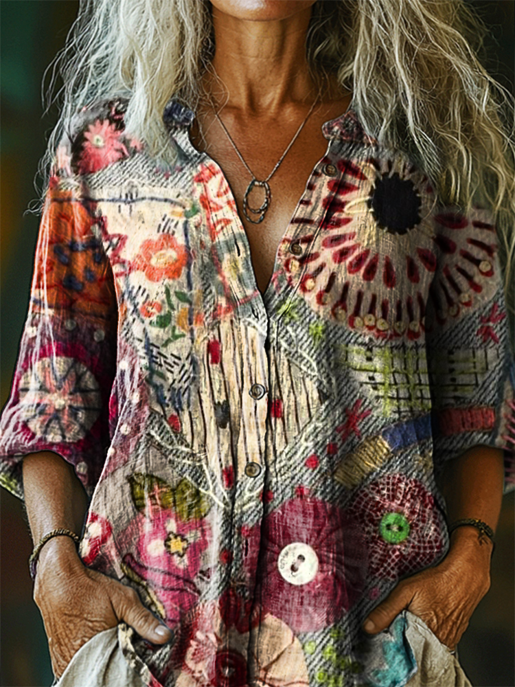 Women's Vintage Patchwork Art Print Casual Cotton Linen Shirt