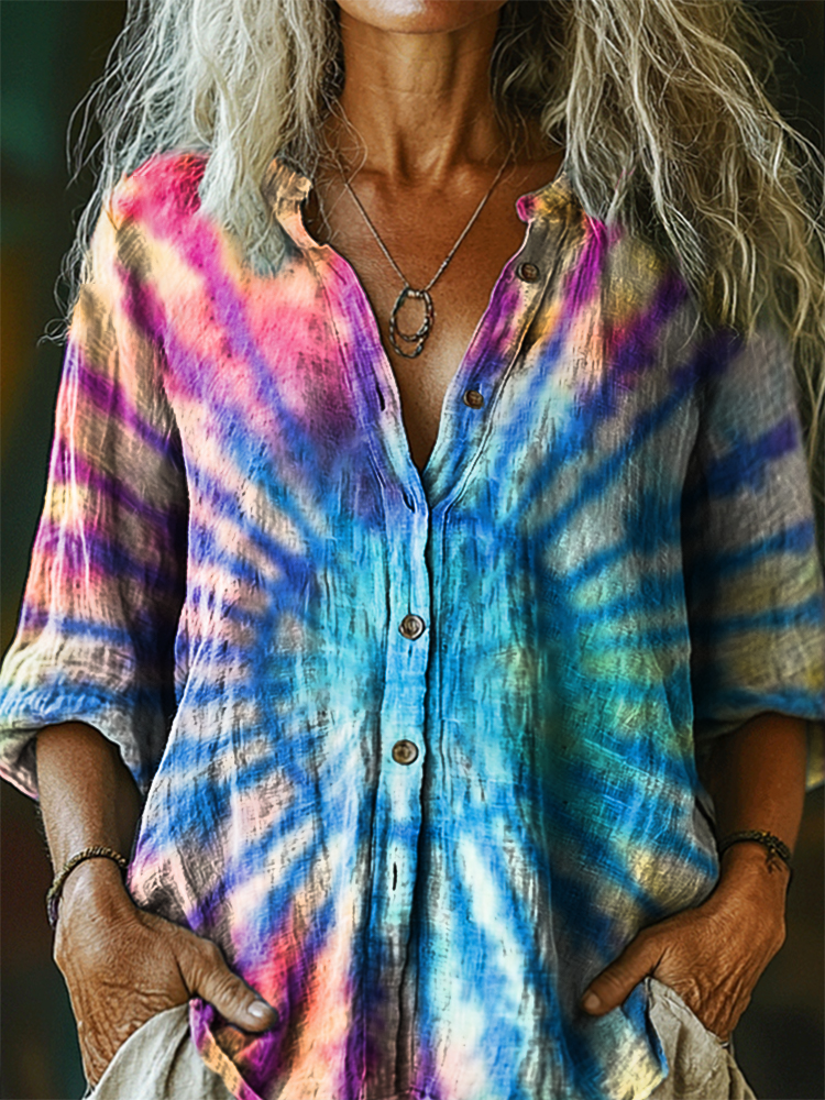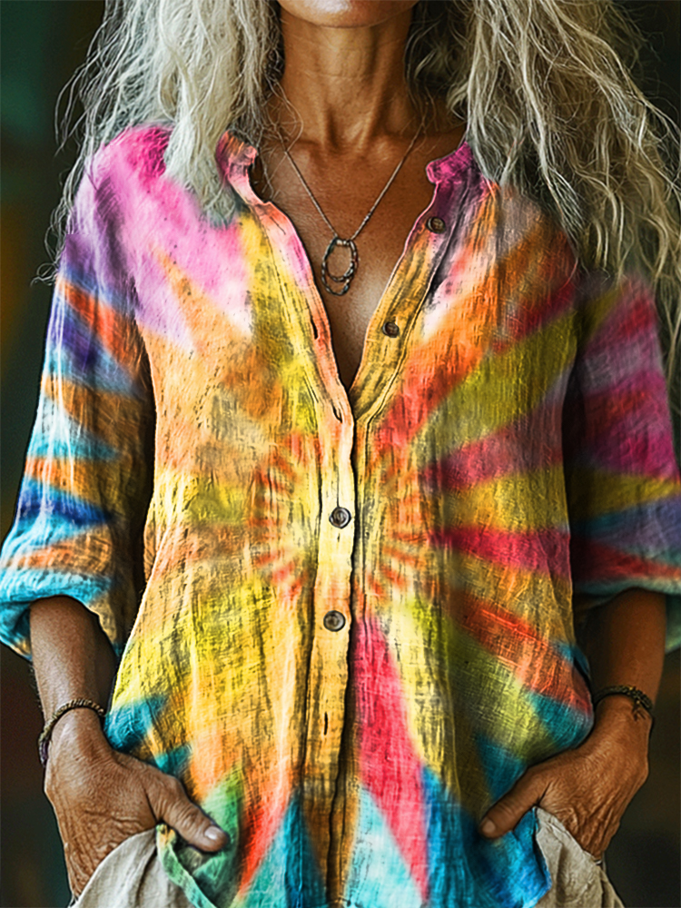 Women's Hippie Tie Dye Art Print Casual Cotton Linen Shirt
