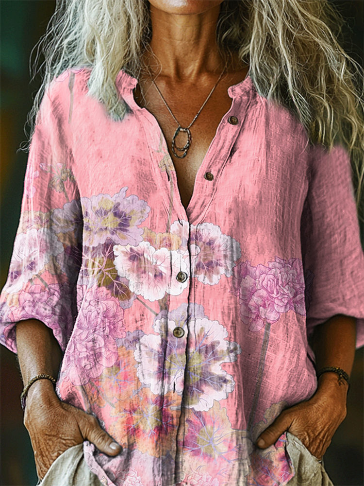 Women's Vintage Floral Art Print Cotton and Linen Shirt