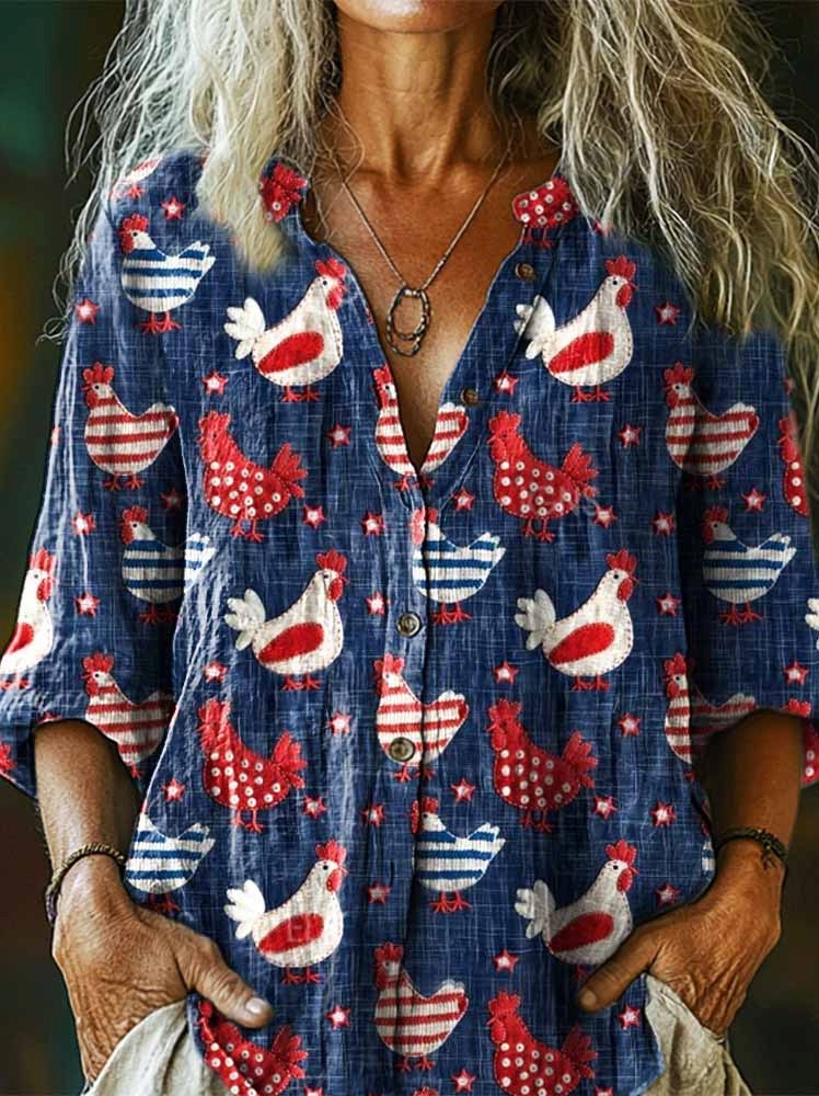 Women's Independence Day Vintage Rooster Art Print Cotton and Linen Shirt