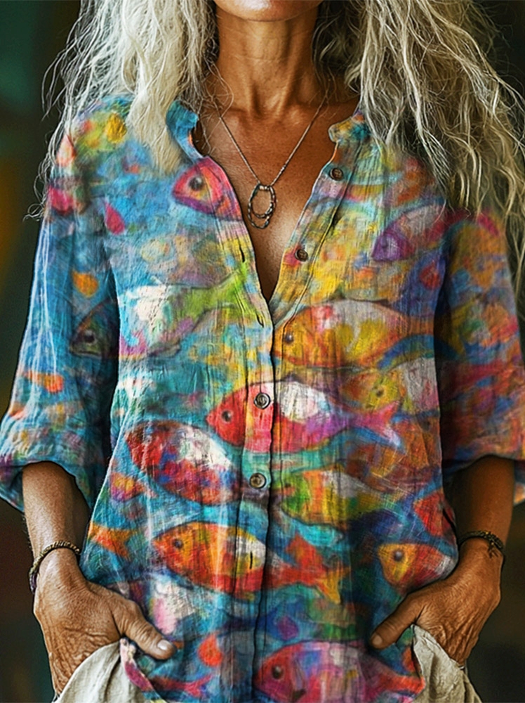 Women's Colorful Fish Art Print Casual Cotton and Linen Shirt