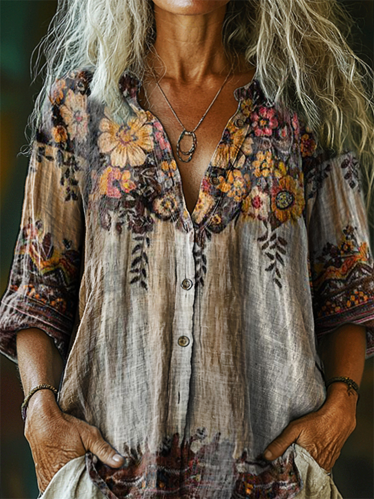 Women's Vintage Ethnic Floral Art Print Linen And Cotton V-neck Casual Shirt