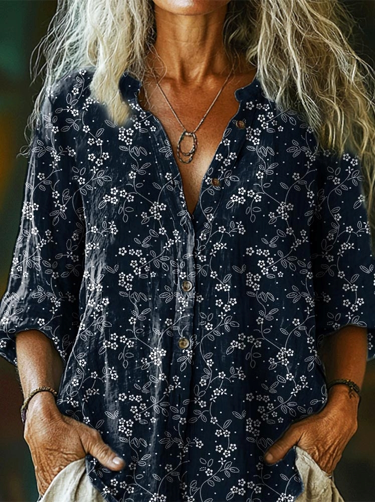 Women's Floral Textured Art Patterns Print Linen And Cotton V-neck Casual Shirt