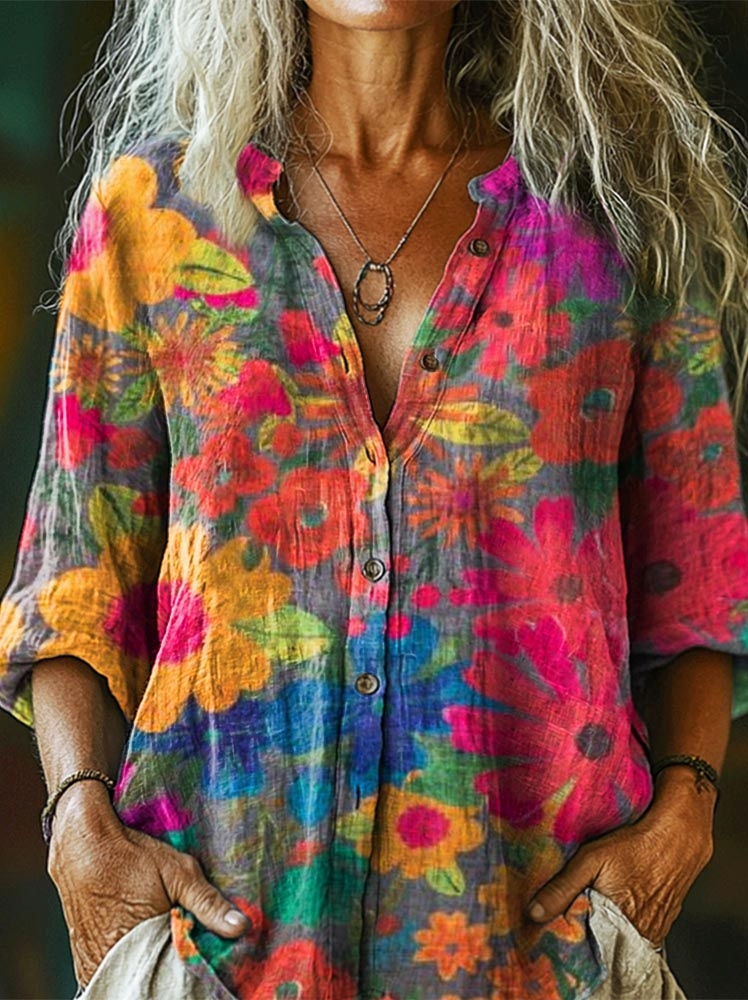 Women's Vintage Bohemian Floral Art Print Casual Cotton Linen Shirt