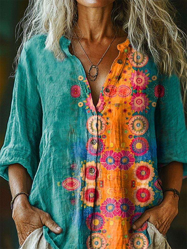 Women's Retro Mandala Art Print Linen And Cotton V-neck Casual Shirt