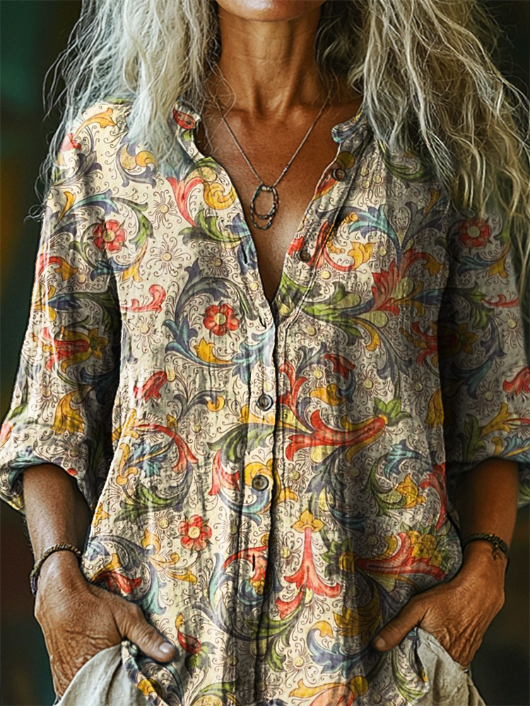 Women's Vintage Floral Art Pattern Print Casual Cotton Linen Shirt