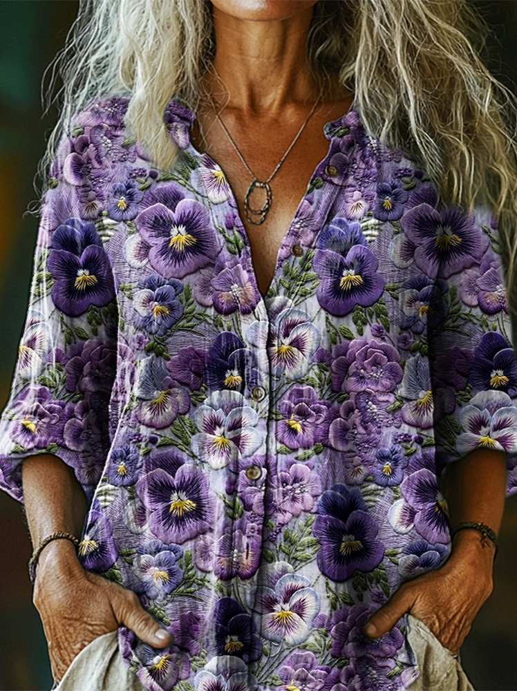 Women's 3d Flower Art Print Casual Cotton Linen Shirt
