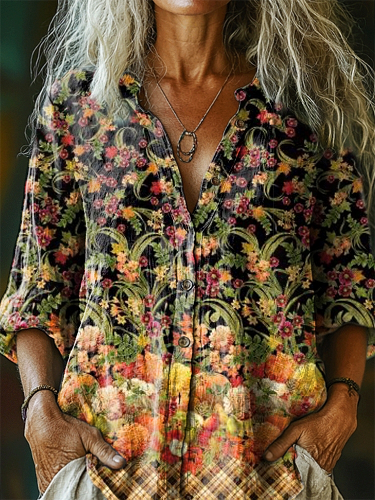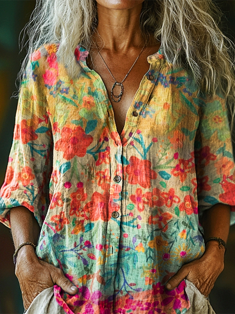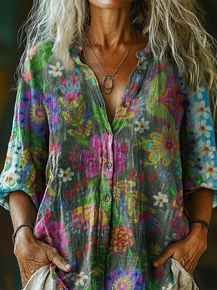 Women's Vintage Bohemian Floral Art Print Casual Cotton Linen Shirt