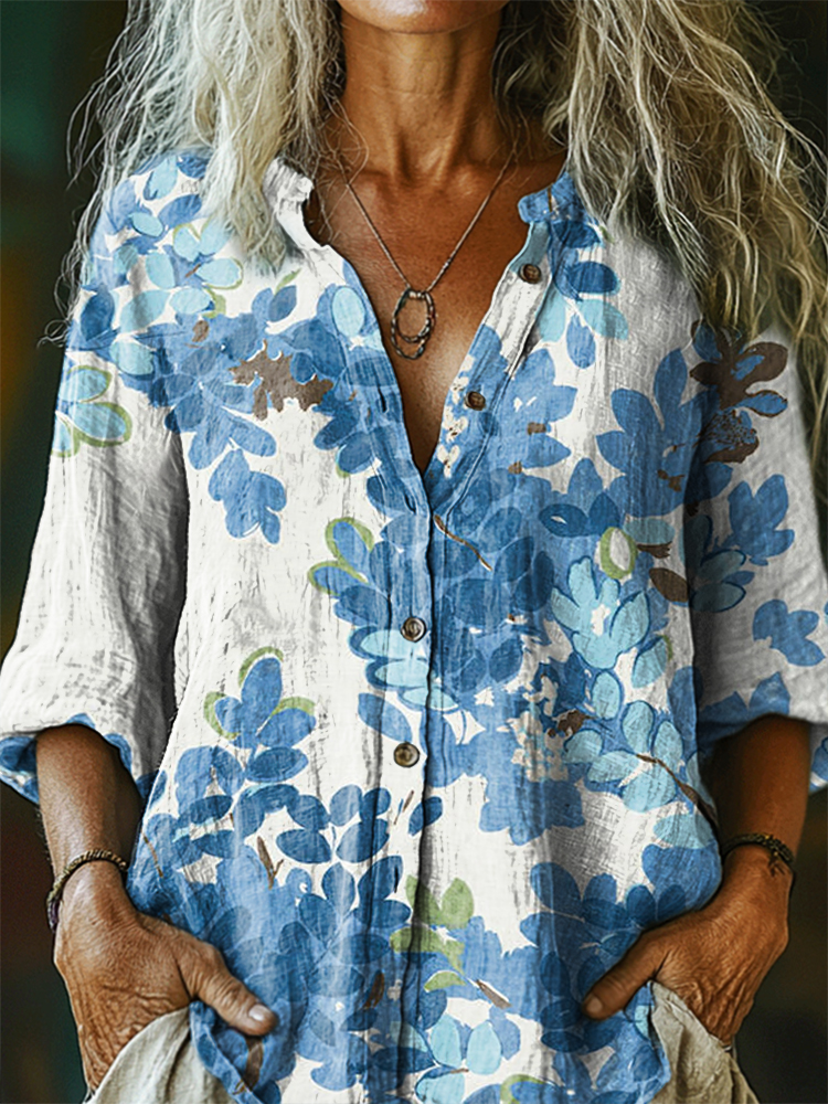 Women's Floral Pattern Art Print Casual Cotton Linen Shirt