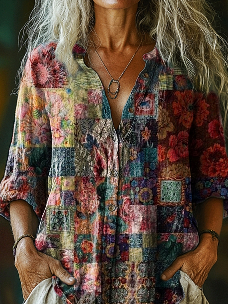 Women's Vintage Floral Patchwork Pattern Print Casual Cotton Linen Shirt