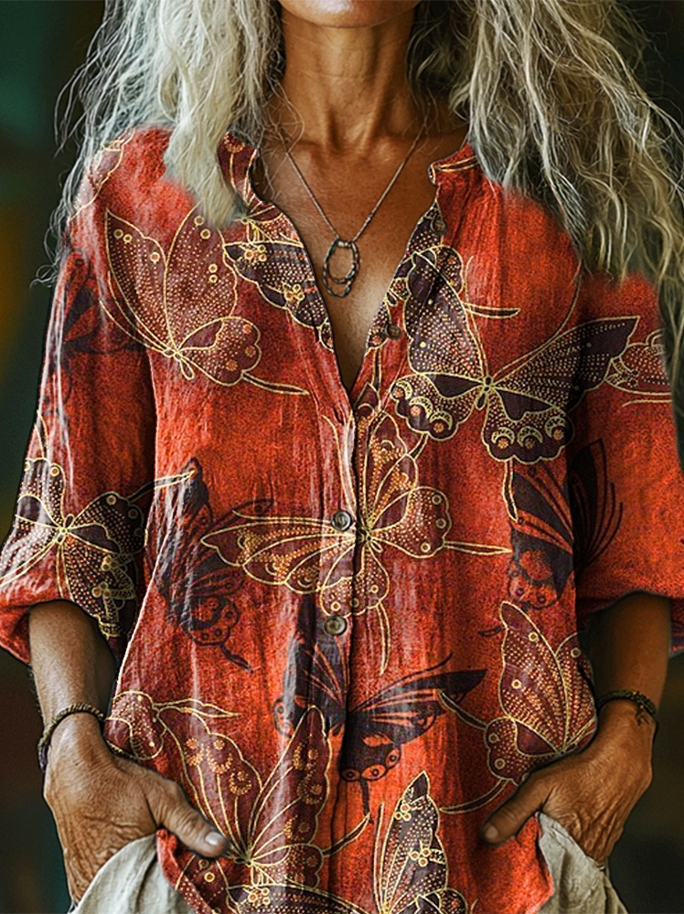 Women's Ethnic Butterfly Art Print Casual Cotton Linen Shirt