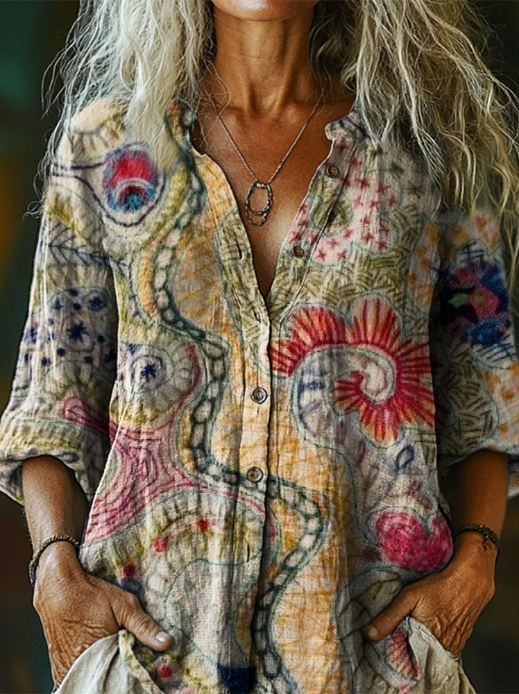Women's Vintage Bohemian Patterns Art Print Casual Cotton Linen Shirt