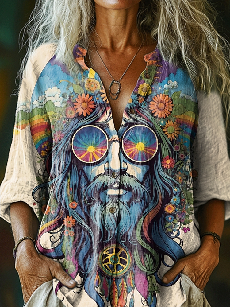 Women's Hippie Face Art Print Casual Cotton Linen Shirt