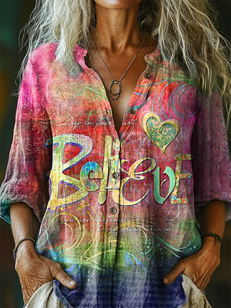 Women's Believe Pattern Art Print Casual Cotton Linen Shirt