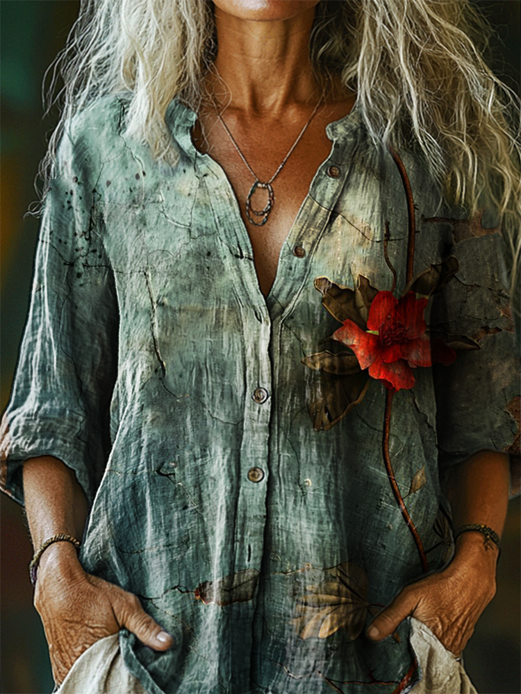 Women's Vintage Texture Art Print Casual Cotton Shirt