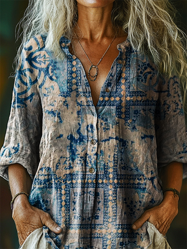 Women's Retro Abstraction Art Print Casual Cotton Linen Shirt