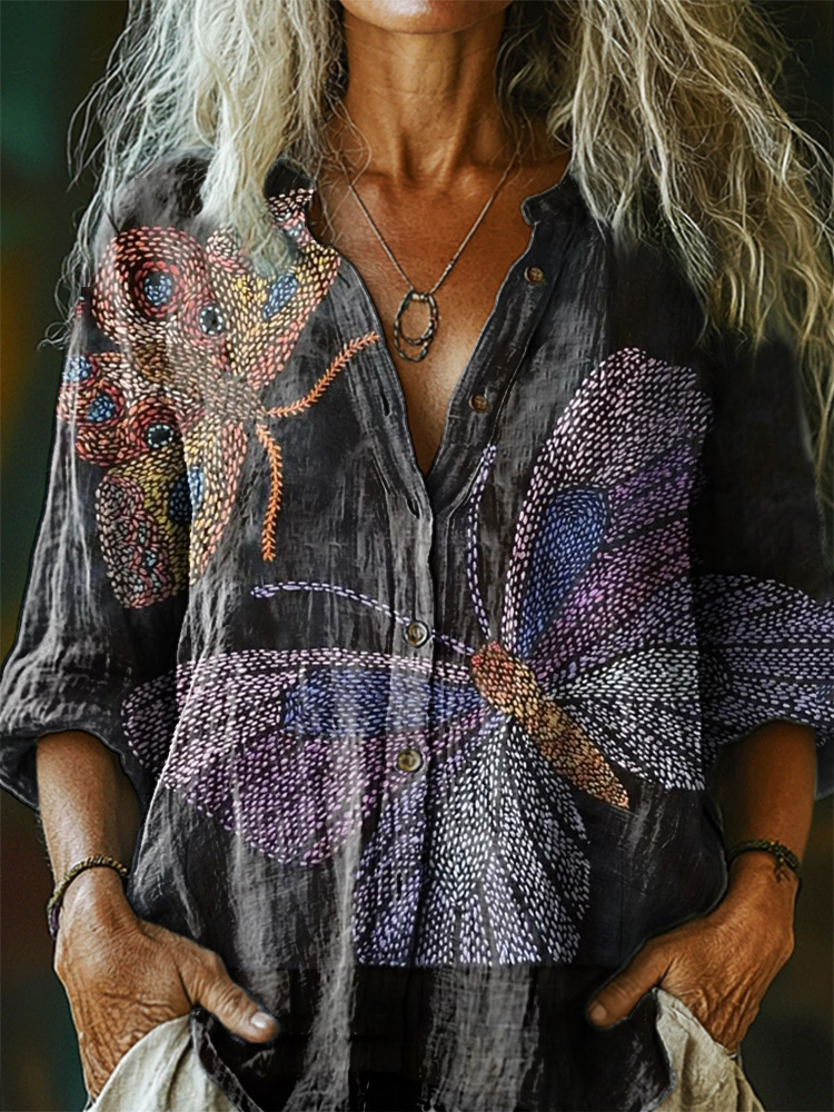 Women's Butterfly Pattern Art Print Casual Cotton Linen Shirt