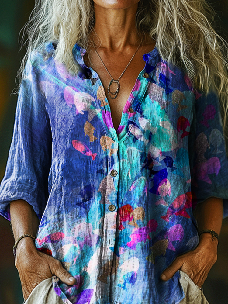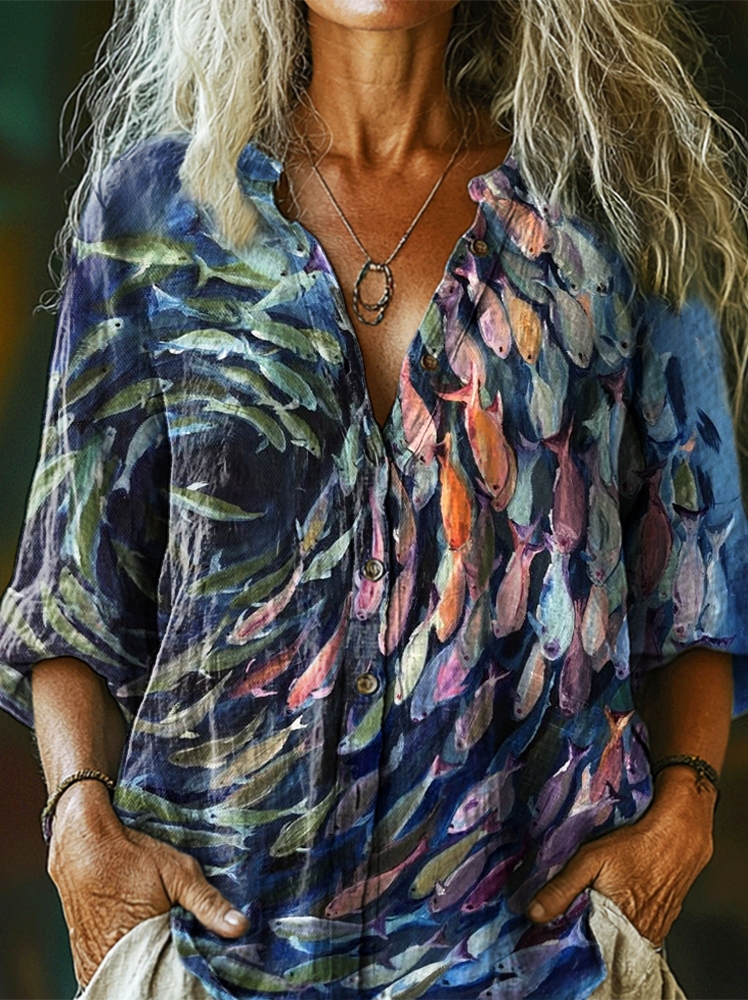 Women's Vintage Fish Art Print Casual Cotton Linen Shirt
