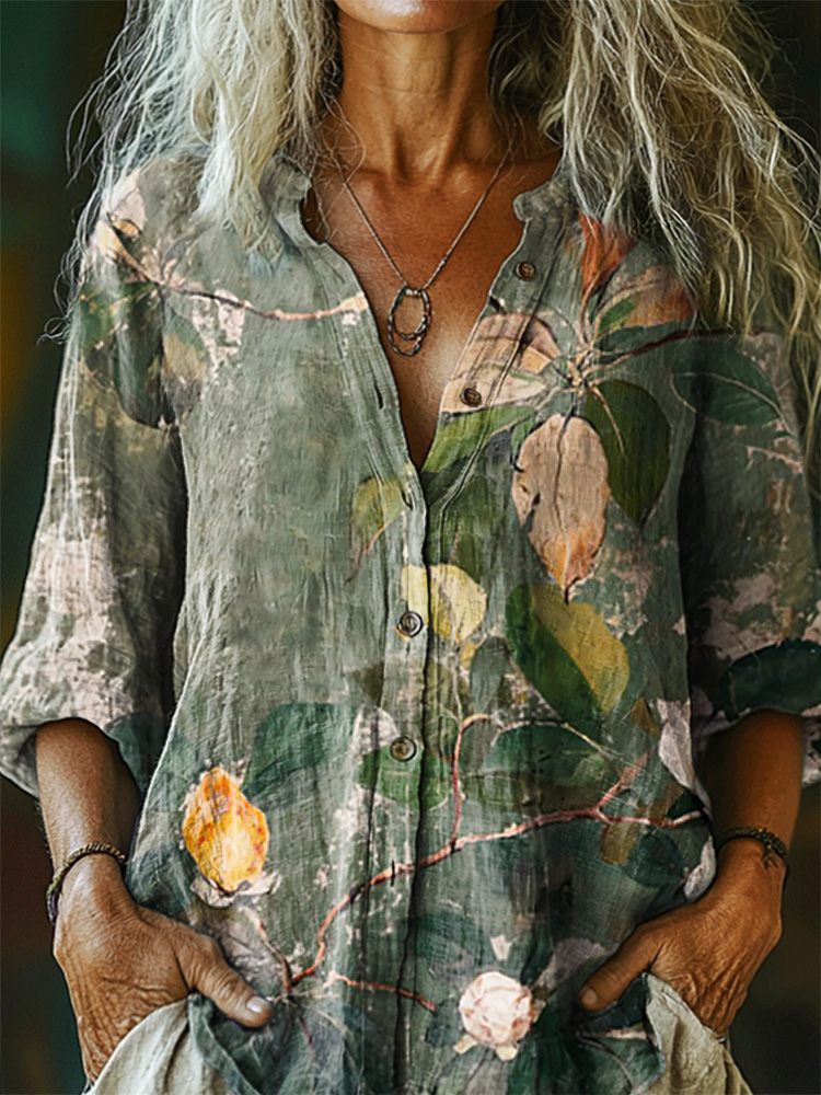 Women's Botanical Pattern Art Print Casual Cotton Linen Shirt