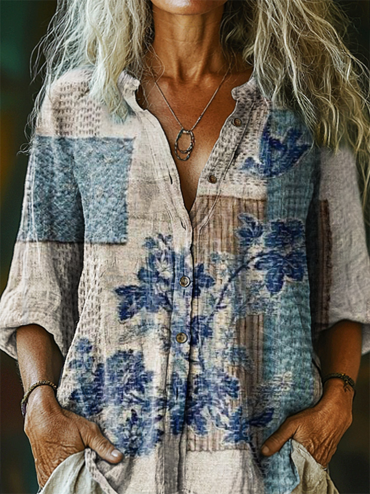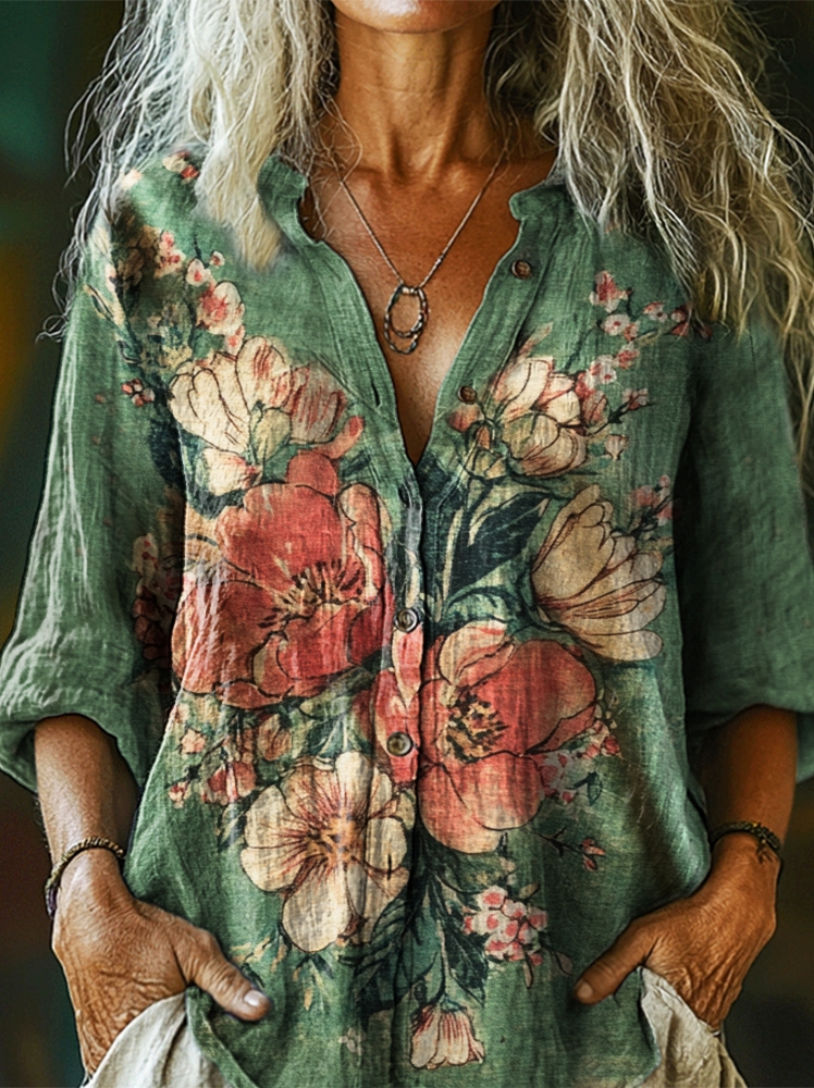 Women's Vintage Floral Art Print Casual Cotton Linen Shirt