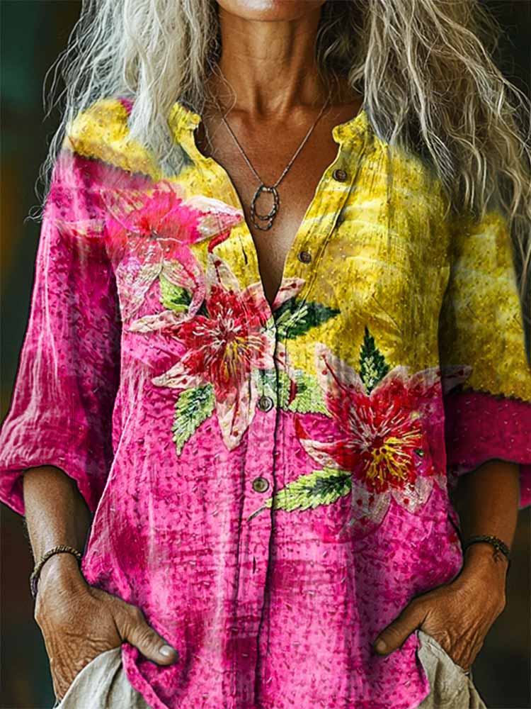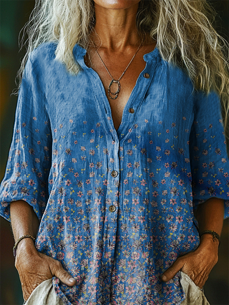Women's Colorful Gradient Floral Print Casual Cotton Linen Shirt