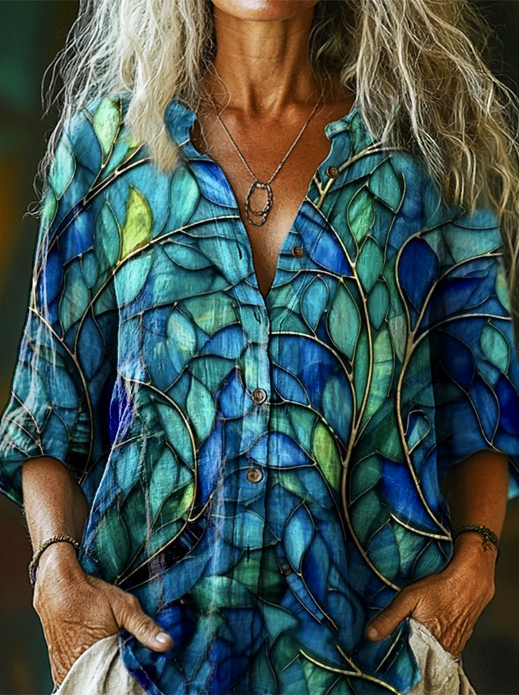 Women's Leaf Art Print Casual Cotton Linen Shirt