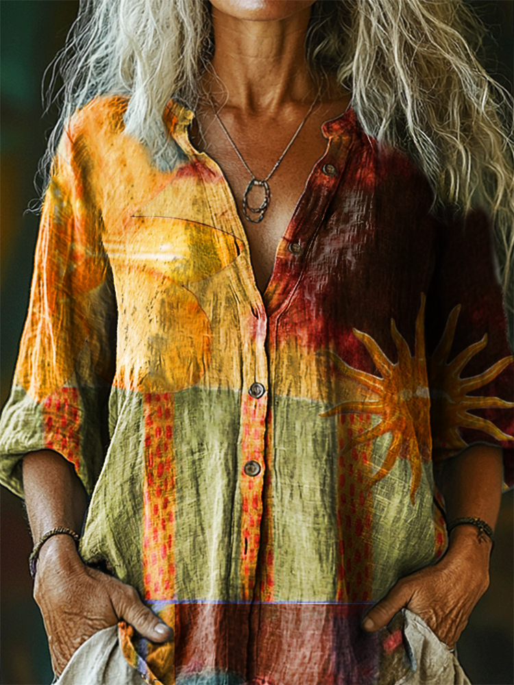Women's Sun Texture Art Print Casual Cotton Linen Shirt