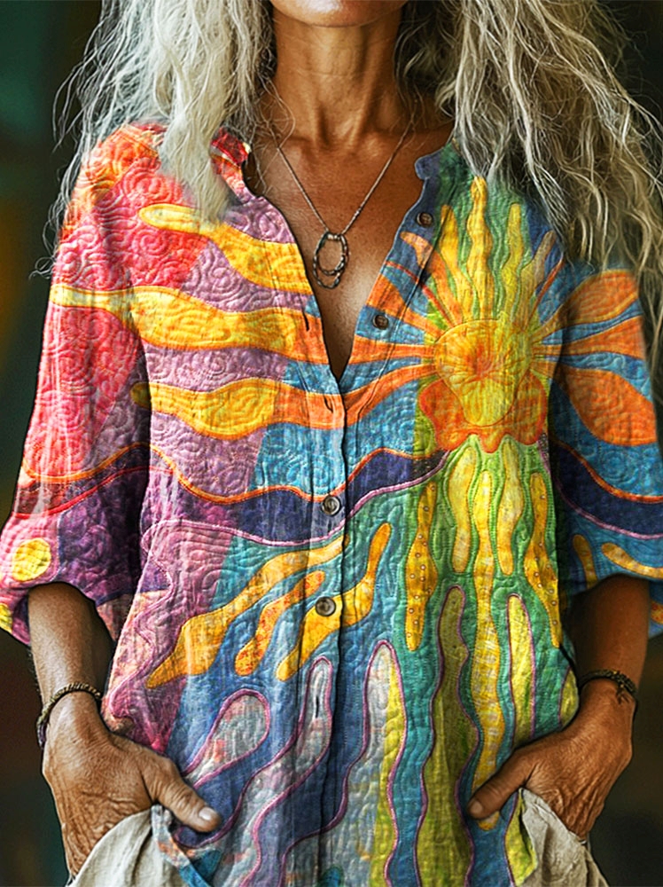 Women's Colorful Sun Texture Art Print Casual Cotton Linen Shirt
