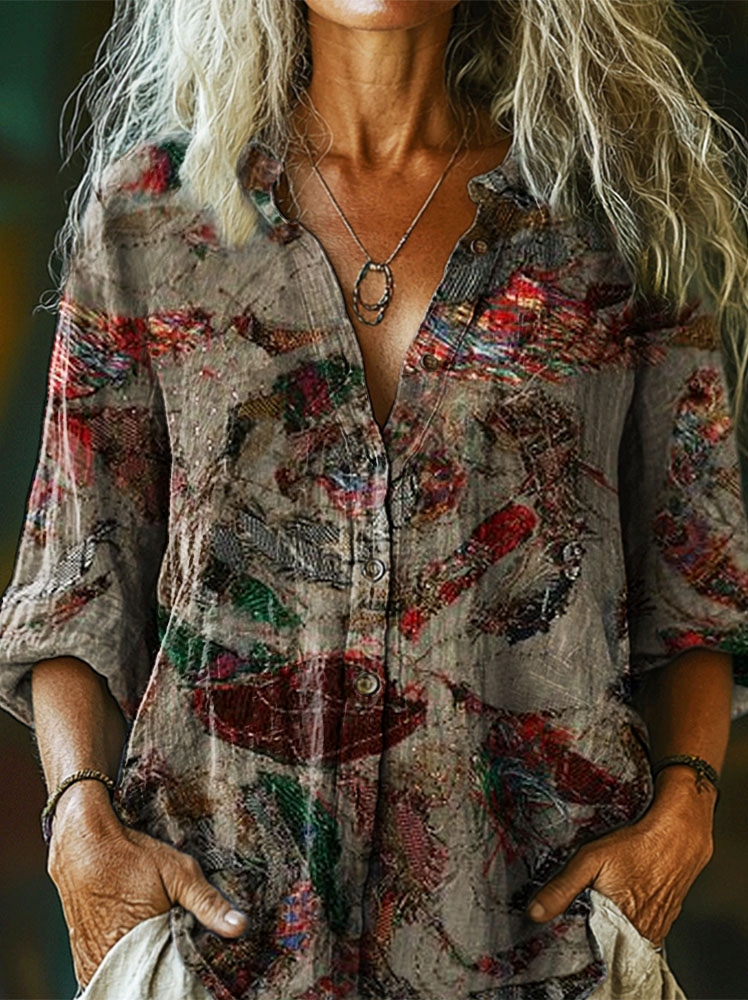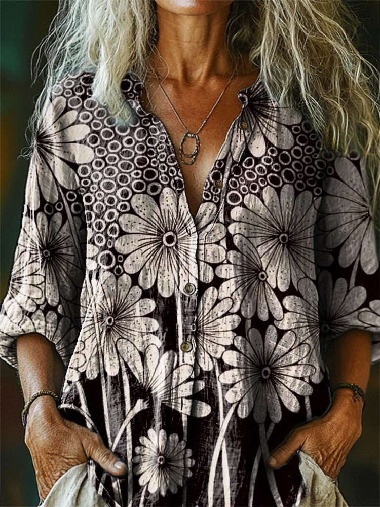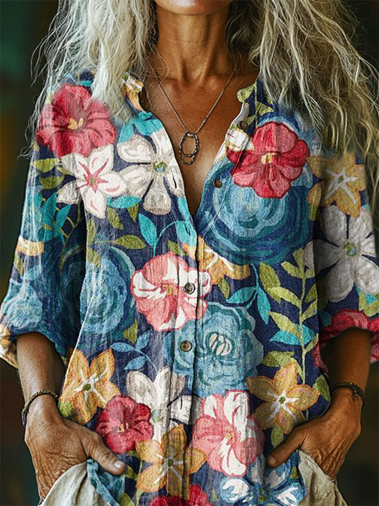 Women's Vintage Flower Art Print Casual Cotton Linen Shirt