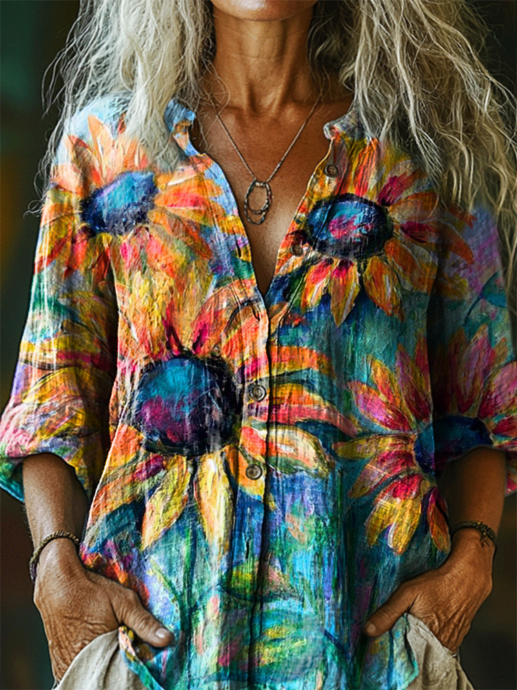 Women's Colorful Daisy Floral Art Print Casual Cotton Linen Shirt