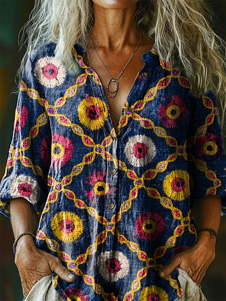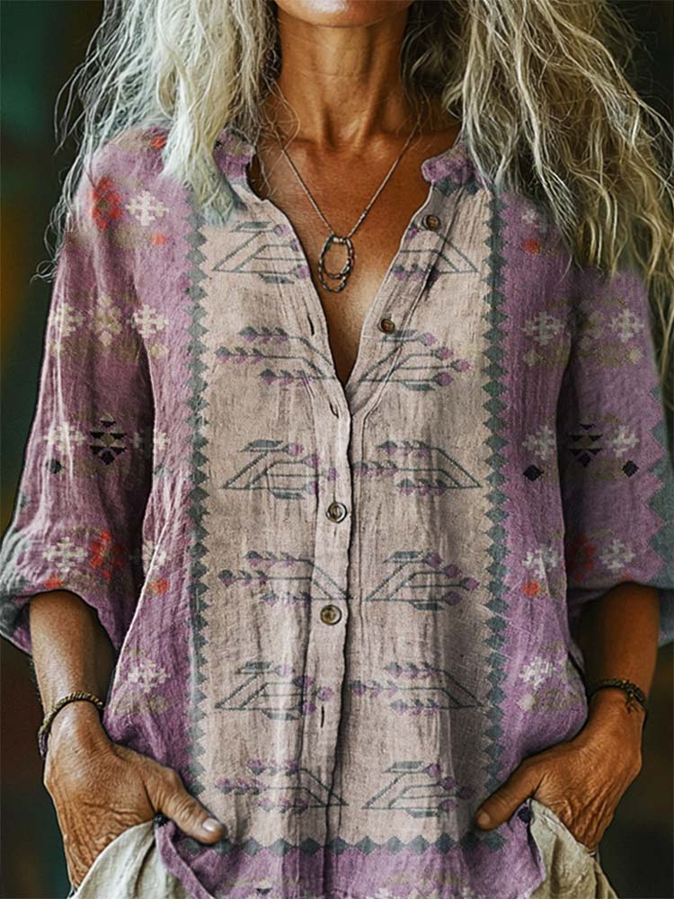 Women's Bohemian Pattern Art Print Casual Cotton Linen Shirt
