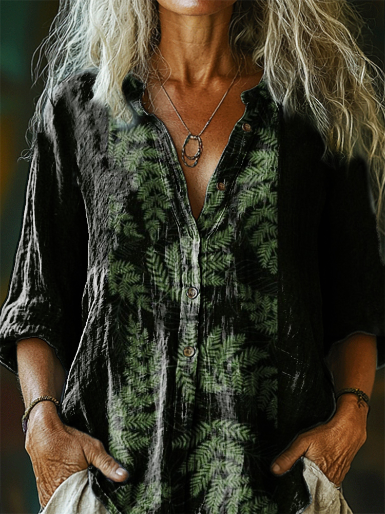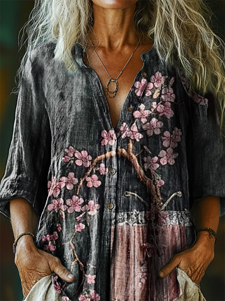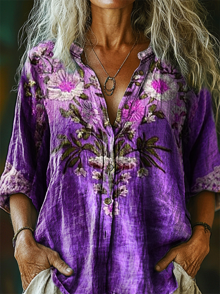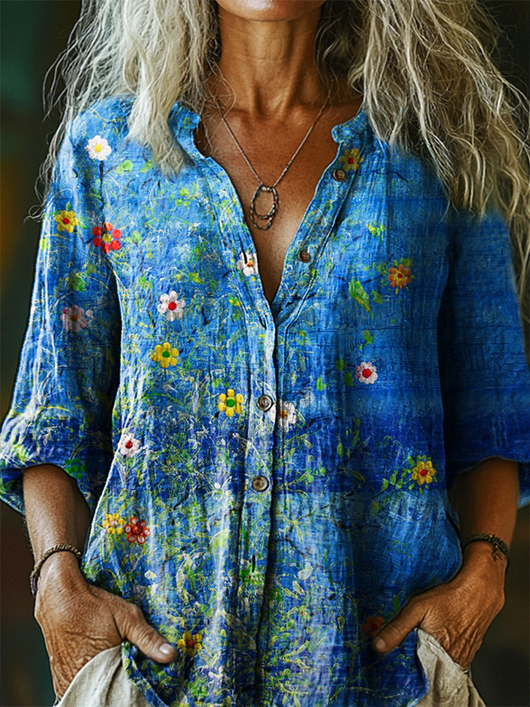 Women's Vintage Floral Art Print Casual Cotton Linen Shirt