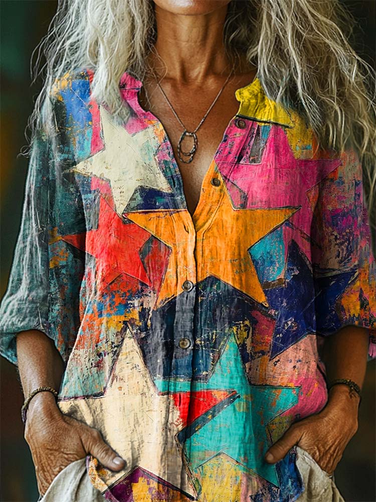 Women's Star Pattern Art Print Casual Cotton Linen Shirt