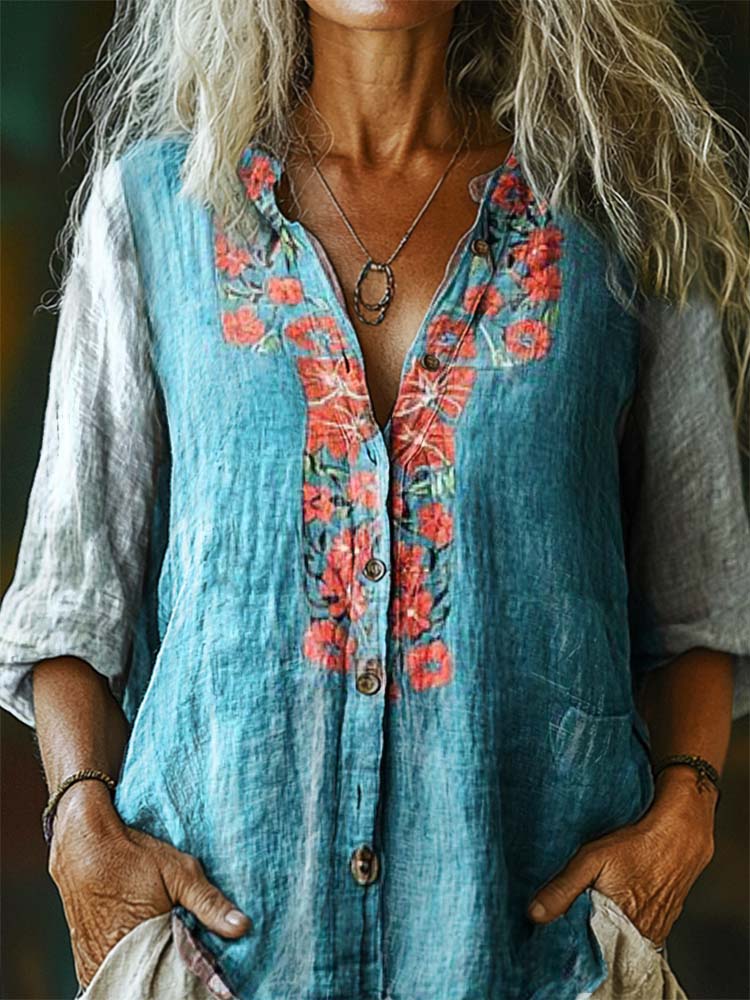 Women's Vintage Floral Splicing Art Print Casual Cotton Linen Shirt
