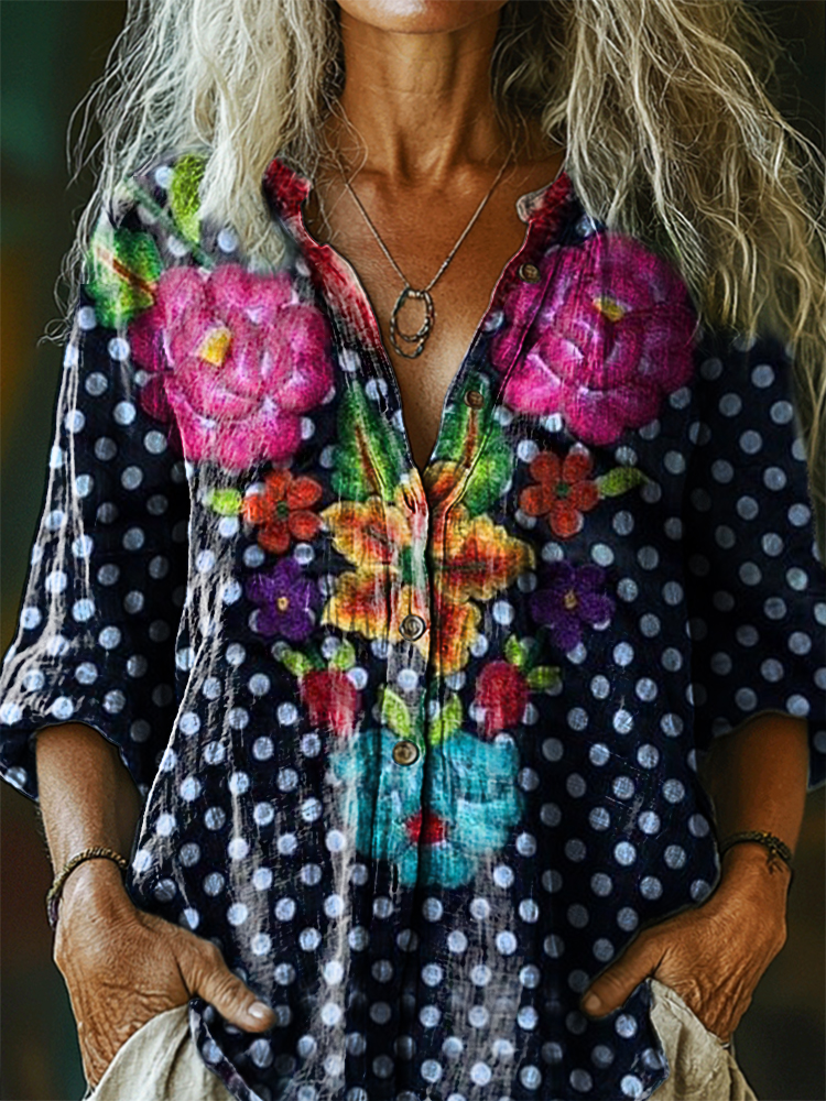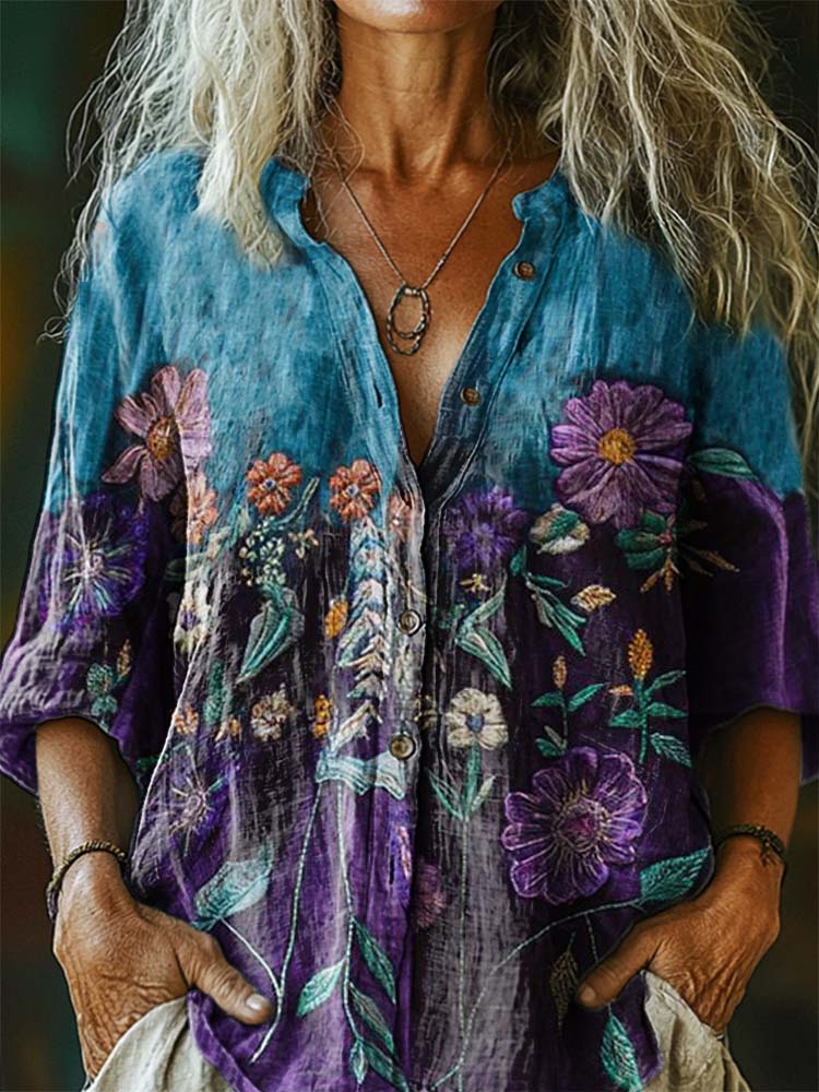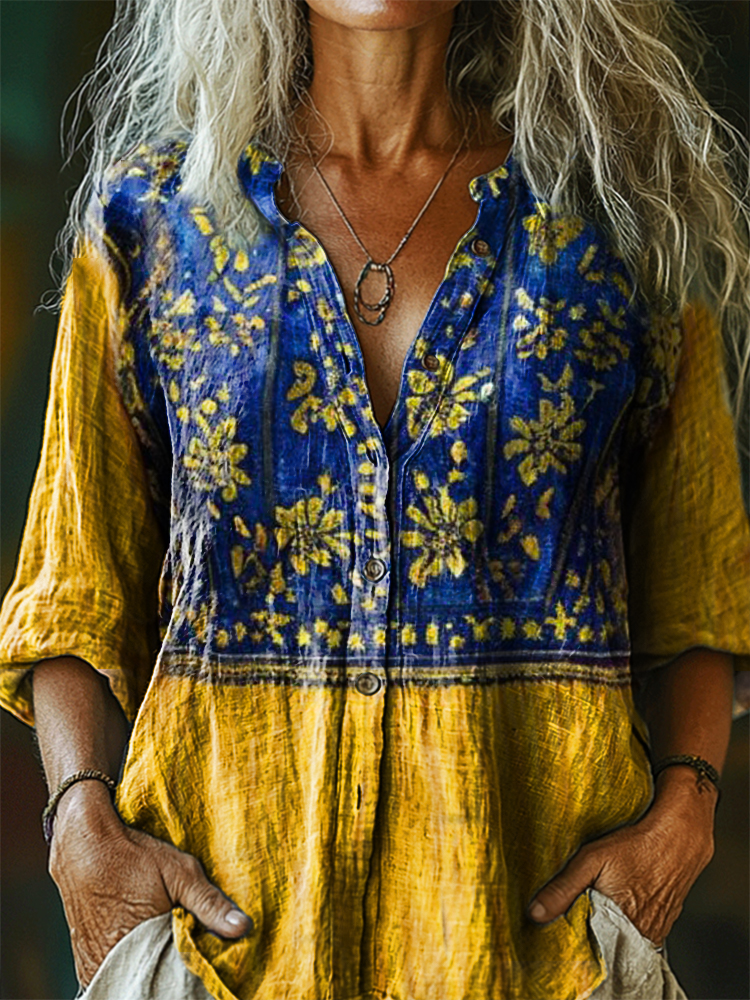 Women's Bohemian Floral Art Print Casual Cotton Linen Shirt