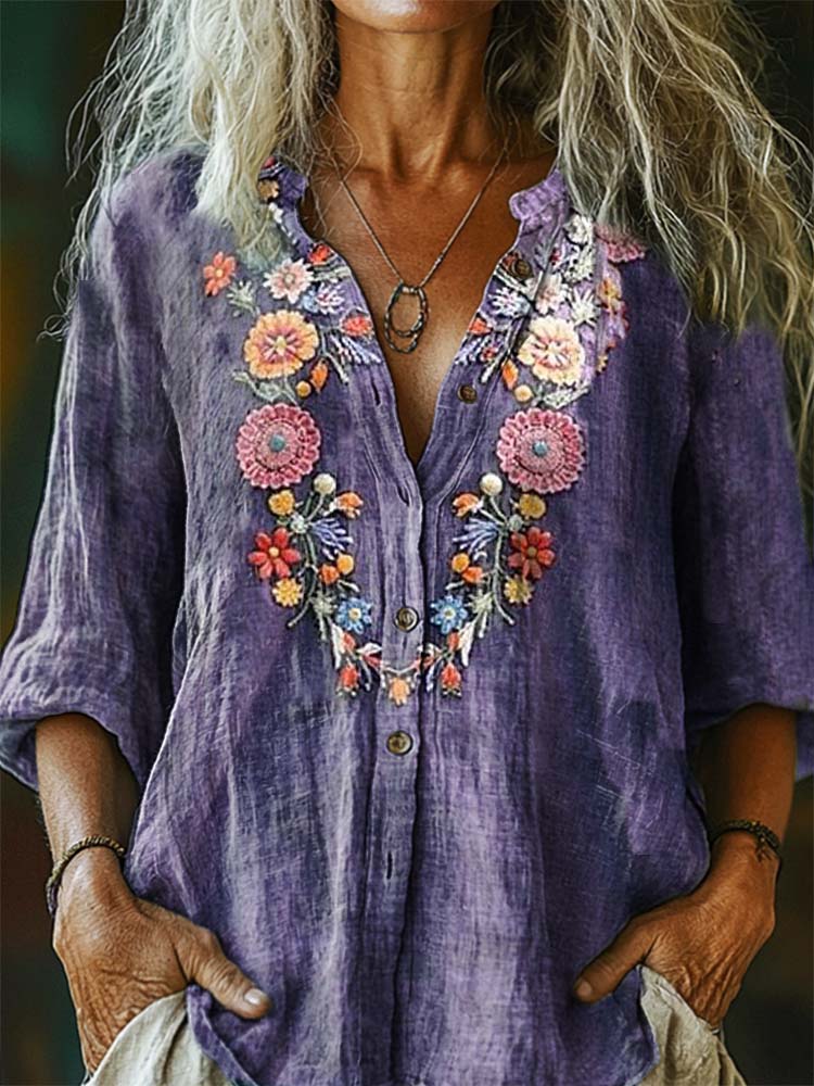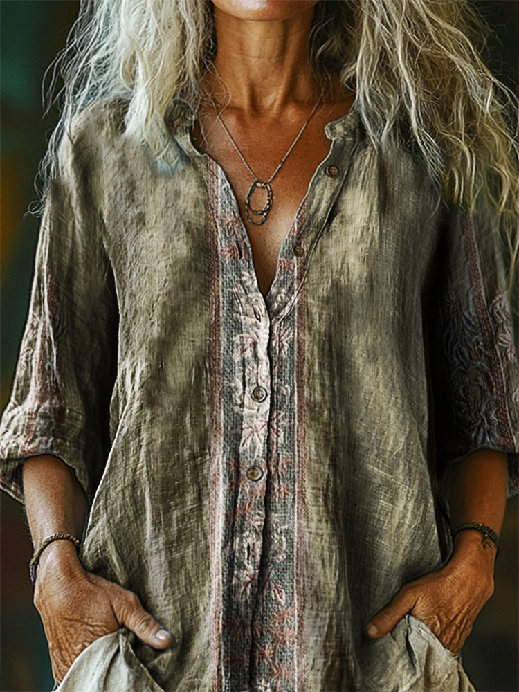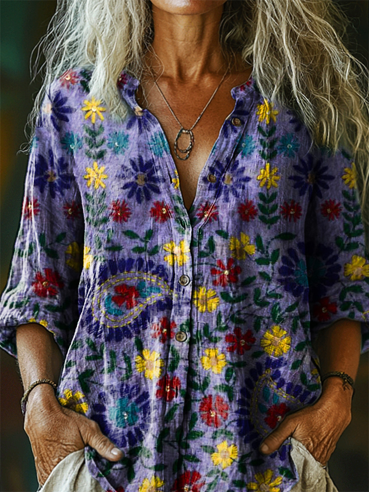 Women's Vintage Ethnic Floral Art Print Casual Cotton Linen Shirt
