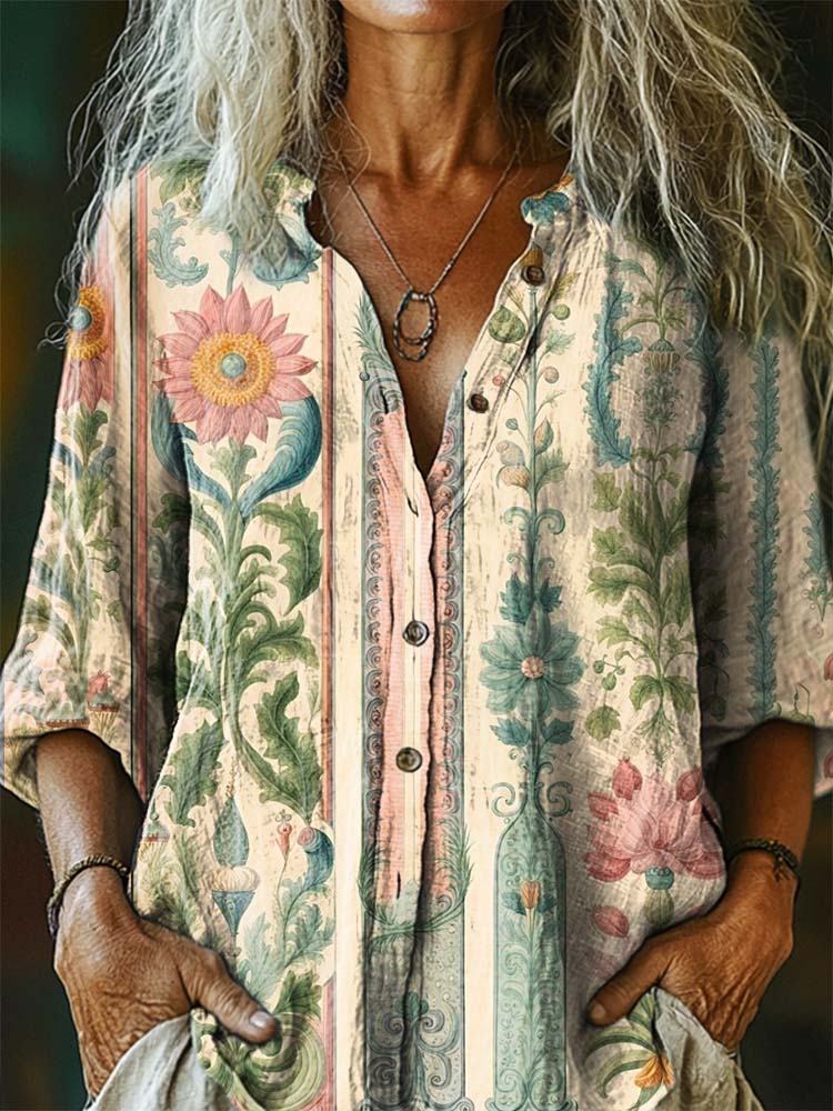 Women's Vintage Floral Pattern Art Print Casual Cotton Linen Shirt