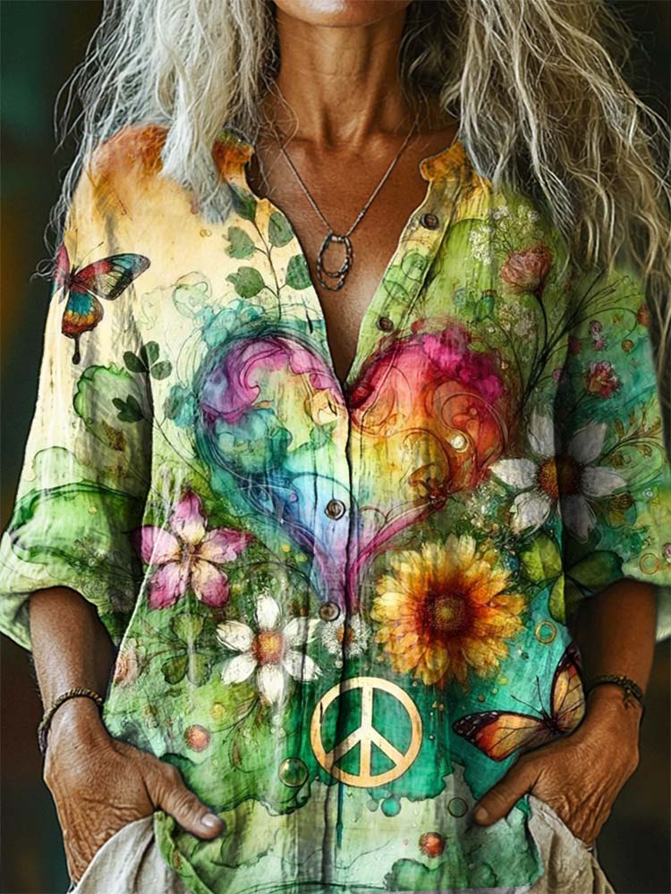 Women's Love Hippie Pattern Art Print Casual Cotton Linen Shirt