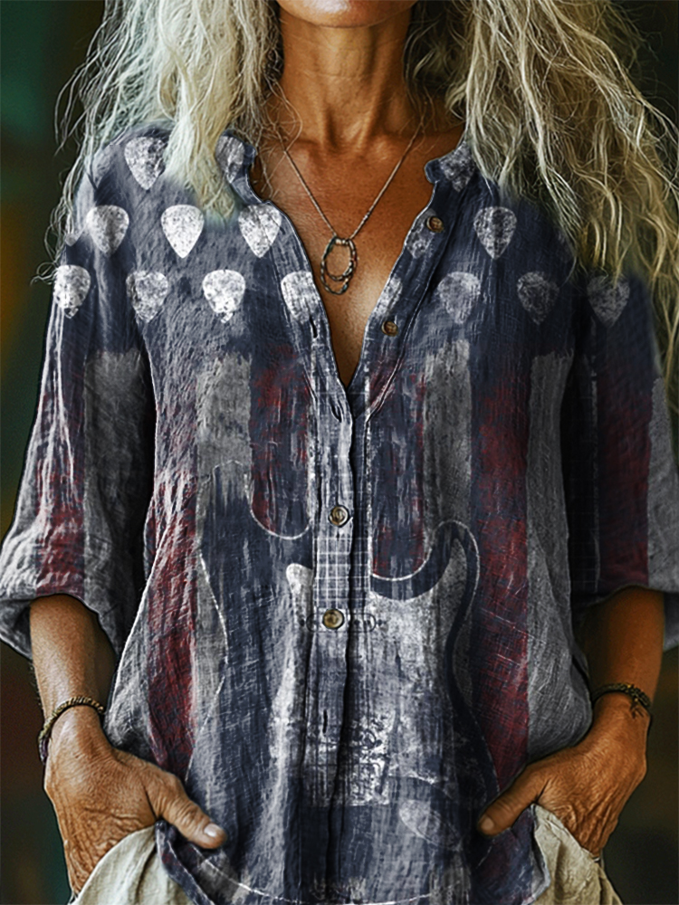 Women's Hippie Flag Guitar Art Print Casual Cotton Linen Shirt