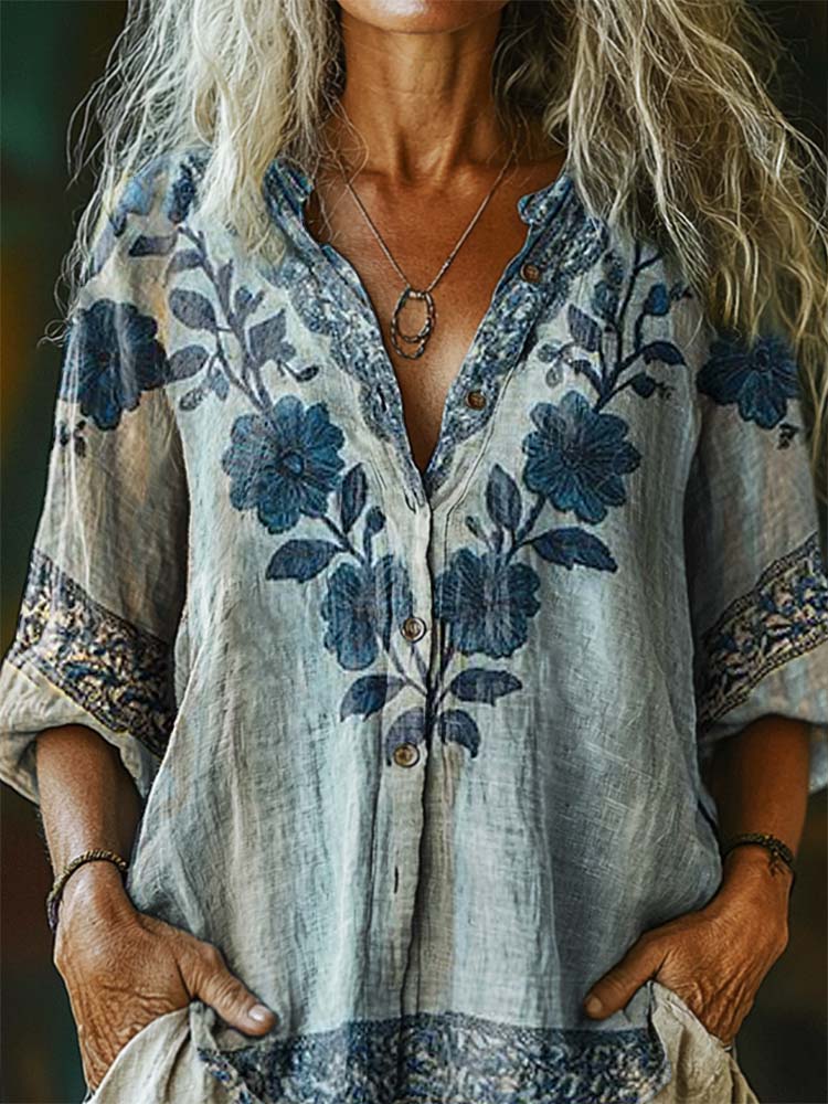 Women's Vintage Bohemian Floral Art Print Casual Cotton Linen Shirt