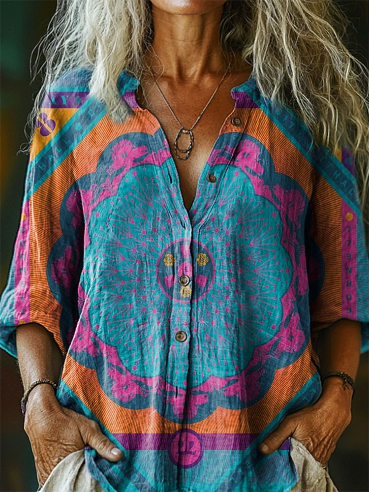 Women's Hippie Pattern Art Print Casual Cotton Linen Shirt