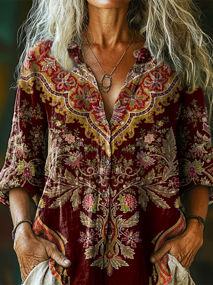 Women's Vintage Ethnic Floral Art Print Casual Cotton Linen Shirt