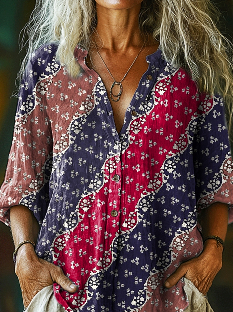 Women's Bohemian Hippie Patchwork Pattern Art Print Casual Cotton Linen Shirt