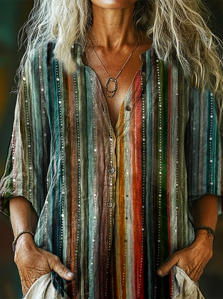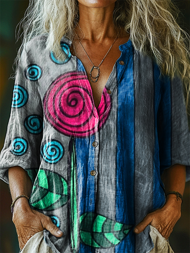 Women's Colorful Gradient Line Art Print Casual Cotton Linen Shirt