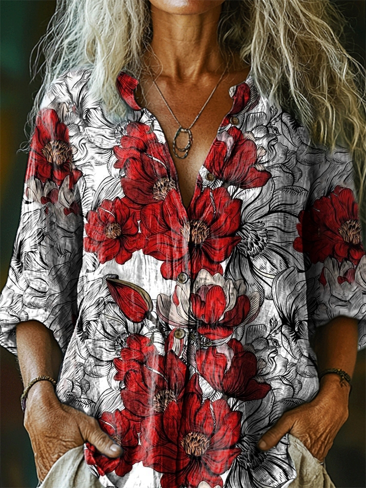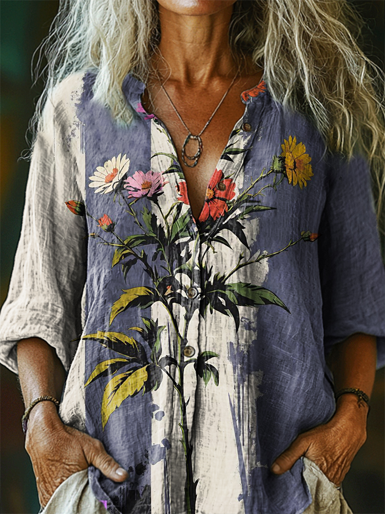 Women's Vintage Floral Art Print Casual Cotton Linen Shirt